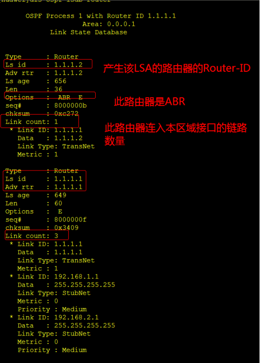 可以看见此区域产生了两条1类LSA, 每条1类LSA都有一个 LINKID,也就是每台路由器各有一个接口直连到此区域,下面是1类LSA的详细信息
