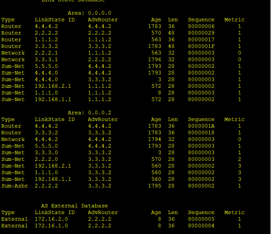 R2是ABR,其接口分别处在area1和area0,area0区域中有4.4.4.2这条LSA信息,因为在R4和R5路由器配置了虚连接,如果没有配置虚连接,这里是不会有4.4.4.2这条LSA信息的,有了虚连接后,相当于R5和R3之间可以直接联系,不经过R4的同意。其他的LSA如R1分析一样。