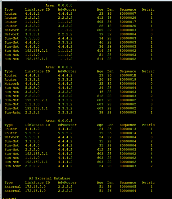如上图,1类LSA (Router)有两条,就是本区域的路由器产生的,2类LSA(Network)有1条,是由 DR产生的,注意他的Metric为0,三类LSA(sum-Net)有四条是由ABR产生的,,例如LINKStrateID为5.5.5.0 AdvRouter 1.1.1.2 可以这样理解,