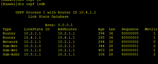 它将AREA1的LSA做个归纳为AREA0生成3类LSA,就是将Area1这个区域的路由信息泛红到Area0中,然后泛红到其他区域,这样其他路由器能根据这个计算到AREA1的路由,反之,区域1的路由器也可以通过ABR泛红过来的其他LSA3了解其他区域的路由,例如,LINKID 5.5.5.0 AdvRouter1.1.1.2可以理解为本区域的路由器要想去5.5.5.0网段,首先得去找1.1.1.2,把本区域的路由信息汇总给1.1.1.2,这个路由器再把那些信息通告出去交给5.5.5.0网段,至于后面怎么交给5.5.5.0网段就不用管了,反正汇总给AdvRouter 1.1.1.2就行了。