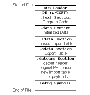 要修改Windows二进制文件,Detours在导出表区和调试符号区之间创建了一个新的.detours区,如上图所示。请注意,调试符号区必须始终位于Windows二进制文件的末尾。新的.detours区包含一个detour header和原始PE头的副本。如果要修改导入表,Detours会创建新的导入表,将其附加到复制的PE副本中,然后修改原始PE头指向新的导入表。最后,Detours在.detours区的末尾写入用户所有的Payloads,并附加调试符号区。从.detorus区恢复原始PE头并删除.detours区,则Detours可以撤消对Widnows二进制文件的修改。