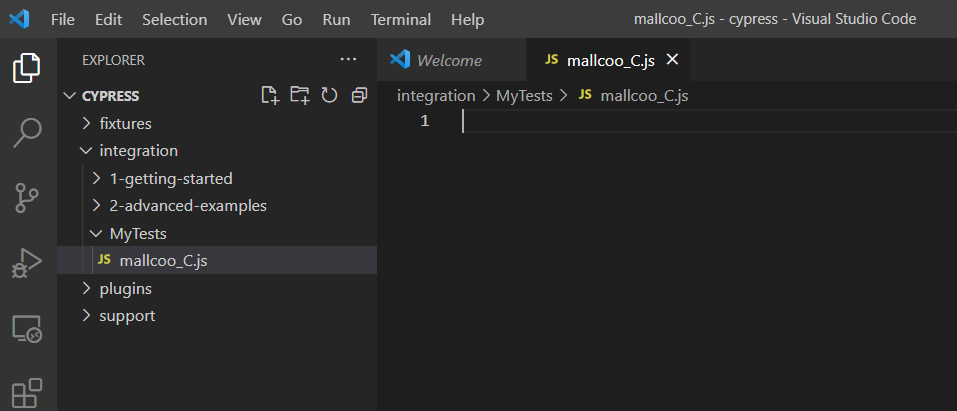 创建第一个用例,右击integration目录>New Folder, 起名为MyTests,再在MyTests下面新建一个mallcoo_C.js的文件,切换到Cypress,你是否发现Cypress自动给你刷新了目录,你新建的mallcoo_C.js测试集文件,它已经帮你监测到了!只不过它现在还没有任何内容。