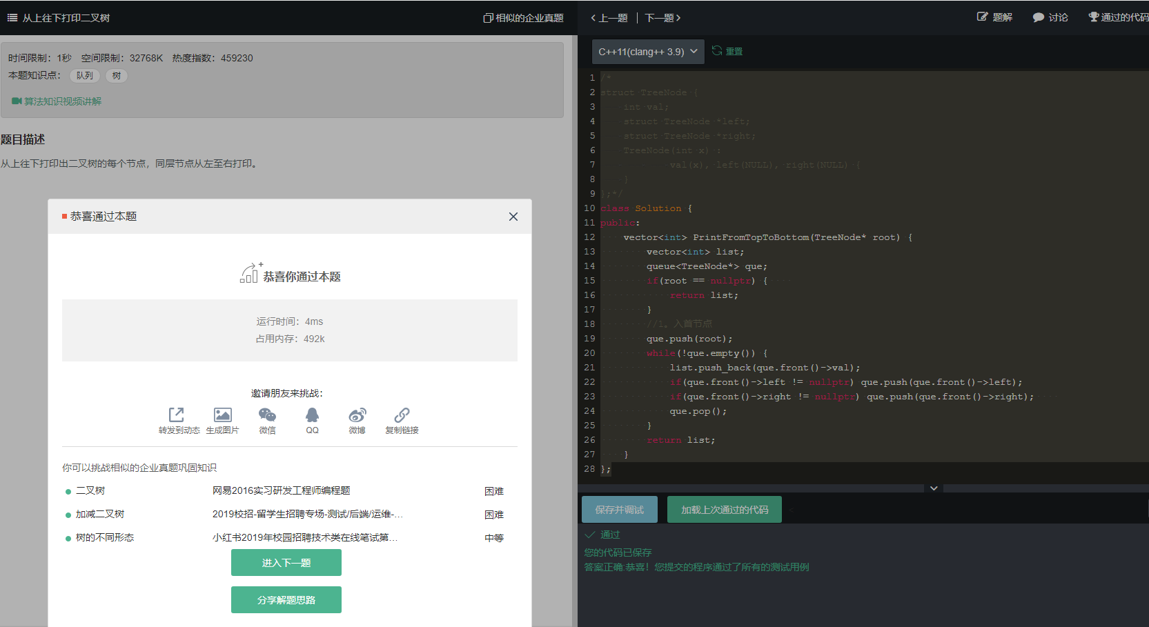 附上代码:注意上的访问队首元素,在本题中是插入到输出数组中。