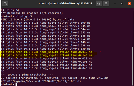 通过Postman工具调用OpenDaylight提供的API下发流表,实现拓扑内主机h1和h3网络中断10s。