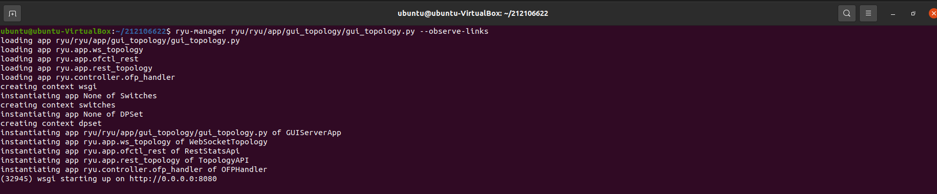 1、搭建下图所示SDN拓扑,协议使用Open Flow 1.0,并连接Ryu控制器,通过Ryu的图形界面查看网络拓扑。