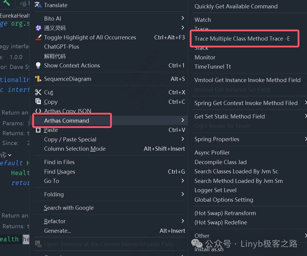 业务的健康检测配置使用的是 springboot 提供的 actuator/health 端点,直觉告诉我们,健康检测代码出现问题的可能性微乎其微。但云厂商的判断让我们不得不重新审视这一观点。为了深入排查问题,我们祭出了强大的工具 ——arthas。通过在 idea 中安装 arthas 插件,我们轻松地执行了跟踪命令:
