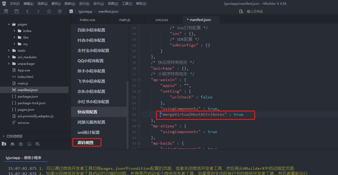 "mp-weixin" : { "appid" : "", ... "mergeVirtualHostAttributes" : true },