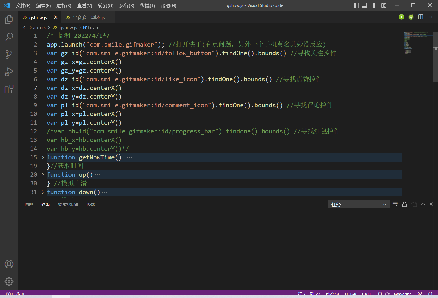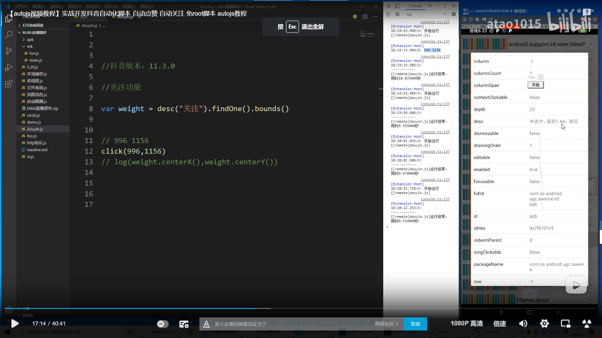 一开始想了模拟上滑、下滑、点赞、浏览评论还有自动领金币这几个功能,因为之前没有看过auto.js相关的教程,所以直接就上b站看了一下。不过UP主“阿涛编程”的教程是抖音,虽然大体上是差不多的,不过因为抖音的是可以找到文字的,而快手的怎么找都没有文字。