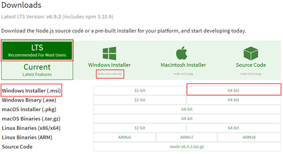 打开官网下载链接:https://nodejs.org/en/download/ 我这里下载的是node-v6.9.2-x64.msi,如下图: