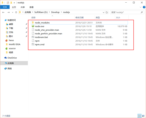 我希望将全模块所在路径和缓存路径放在我node.js安装的文件夹中,则在我安装的文件夹【D:\Develop\nodejs】下创建两个文件夹【node_global】及【node_cache】如下图: