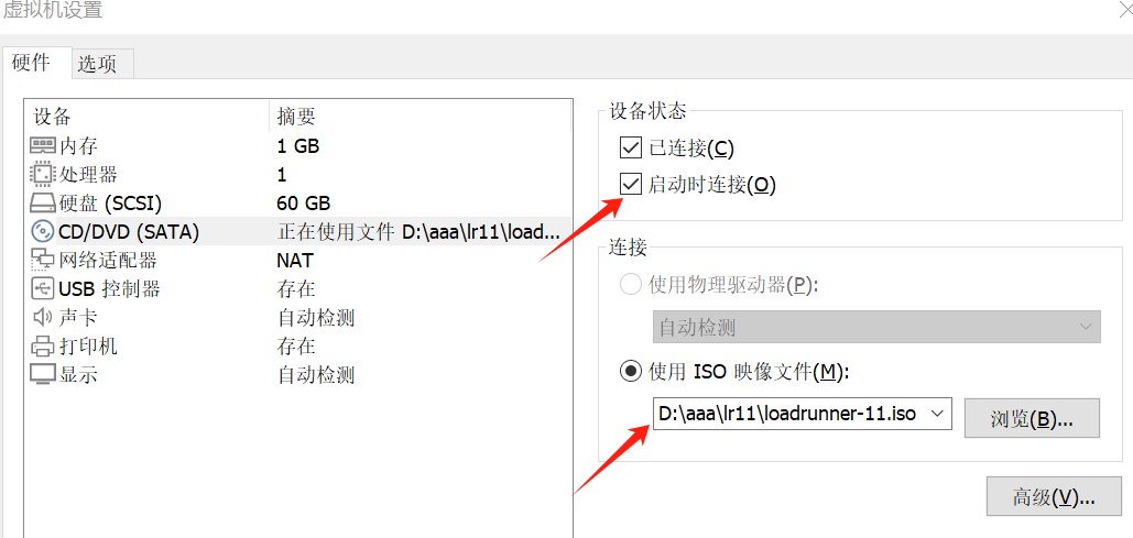 2、选择win7系统,右键设置-选择本地lrISO文件,勾选启动时连接,这样lrISO文件就被装载到win7系统里(不要开启虚拟机,开启后无法进行设置)