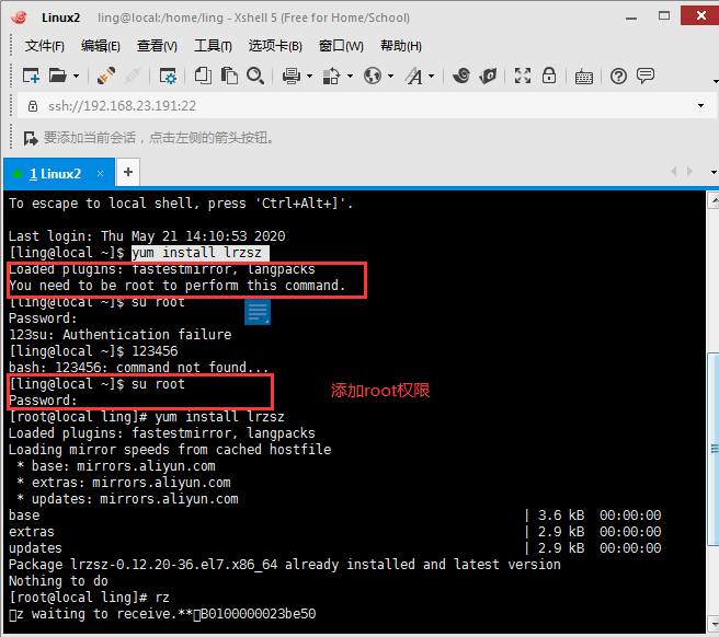 b.如果输入yum install lrzsz (lrzsz是一款在linux里可代替ftp上传和下载的程序。),遇到下面问题时,添加root权限: