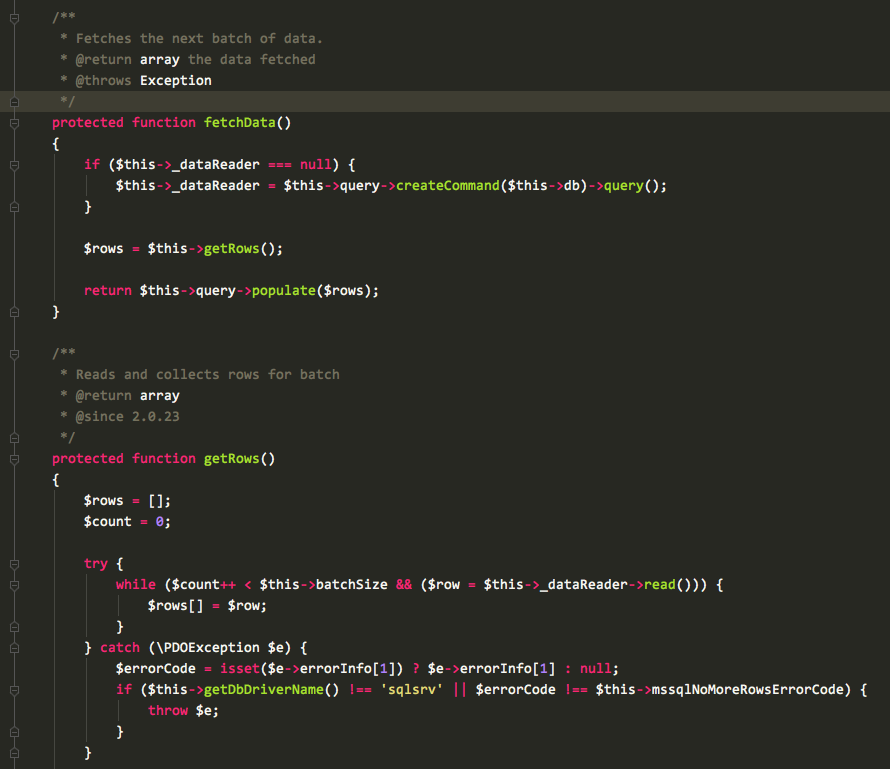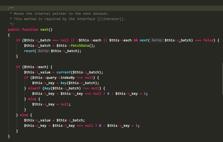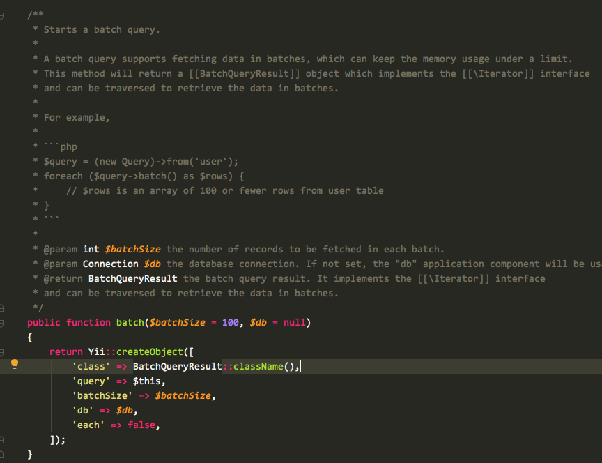 具体实现细节看fetchData这个函数,这里本质是填充数据,获取数据调用的是 _dataReadeder->read(), 追踪函数会发现其实调用的是PDO::fetch()函数,限制获取数量的条件是batchSize,到这里each()和batch()其实是一样的,具体这两个函数的区别要看next()函数: