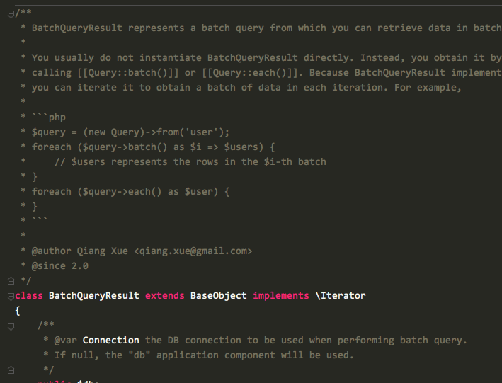 先看源码,each()和batch()函数都是调用BatchQueryResult这个类,唯一的区别是each这个参数,而这个类它实现了Iterator接口,这也就说明了为什么each和batch都要用foreach来调用。