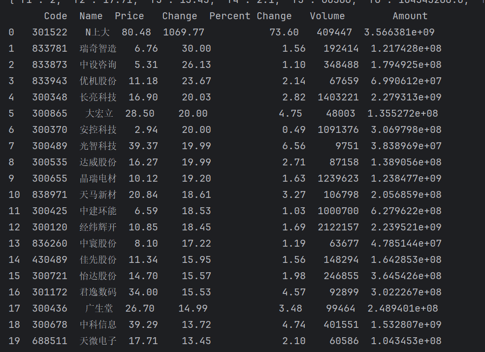 df = pd.DataFrame(rows, columns=['Code', 'Name', 'Price', 'Change', 'Percent Change', 'Volume', 'Amount'])