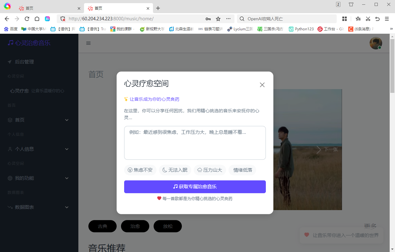 | 项目简介 | 本项目旨在开发一个免费的公益音乐疗愈平台,为心理疾病患者提供个性化的音乐推荐服务。 项目目标: 现有的音乐软件大多需要付费会员,并且存在打榜等非个性化推荐现象。我们希望通过该项目,为心理疾病患者提供一个免费、个性化的音乐疗愈平台,帮助他们通过音乐缓解心理压力,改善情绪。 项目需求: 市面上的音乐软件大多存在付费门槛和打榜现象,无法满足个性化推荐需求。我们希望开发一个能够根据患者和医生的建议,提供个性化音乐推荐的系统,帮助患者获得更舒适的音乐疗愈体验。 |