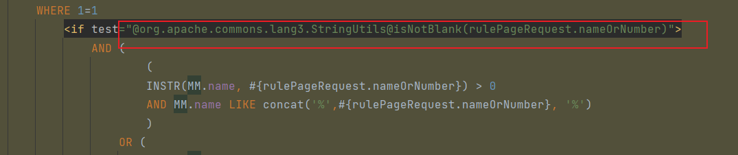 <if test="@org.apache.commons.lang3.StringUtils@isNotBlank(rulePageRequest.nameOrNumber)"> AND ( ( INSTR(MM.name, #{rulePageRequest.nameOrNumber}) > 0 AND MM.name LIKE concat('%',#{rulePageRequest.nameOrNumber}, '%') ) OR ( INSTR(MM.number, #{rulePageRequest.nameOrNumber}) > 0 AND MM.number LIKE concat('%', #{rulePageRequest.nameOrNumber}, '%') ) ) </if>