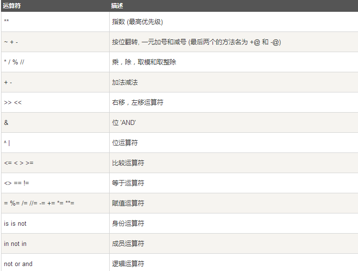 | ** | 幂 - 返回x的y次幂 | a**b 为10的20次方, 输出结果 100000000000000000000 |
