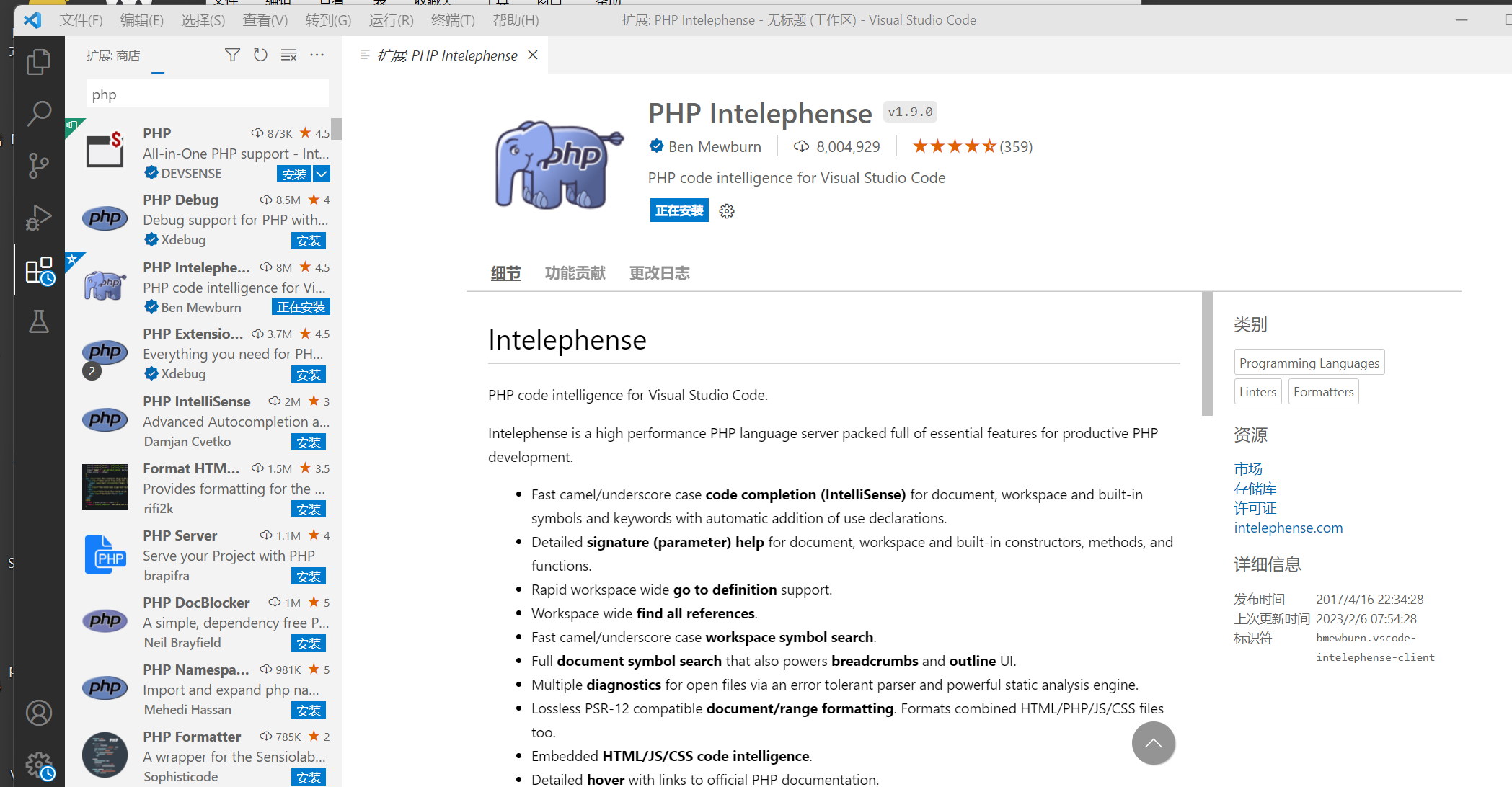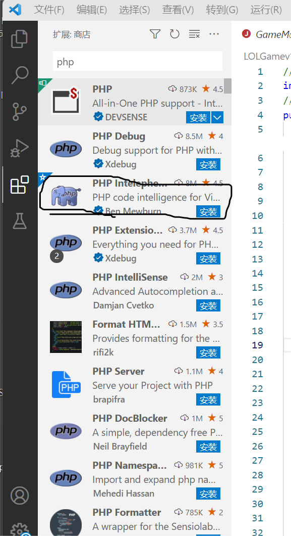 打开vscode,在左侧栏点击扩展,搜索php,下载