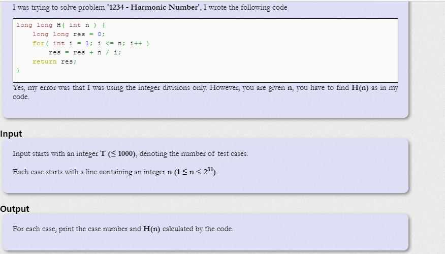 #include<iostream> #include<algorithm> using namespace std; typedef long long ll; /* 要找到是[n/i]==[n/j]中的最大的j; j=[n/[n/i]] */ int main(){ ll n; int t; cin>>t; int kase=1; while(t--){ cin>>n; ll ans=0; ll l,r; for(l=1;l<=n;l=r+1){ if(n/l==0){ break; } r=min(n,n/(n/l)); ans+=(n/l)*(r-l+1); } printf("Case %d: %lld\n",kase++,ans); } }