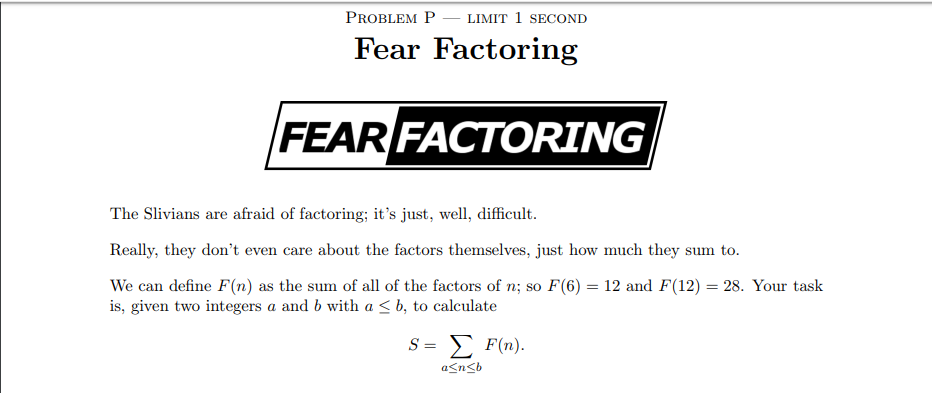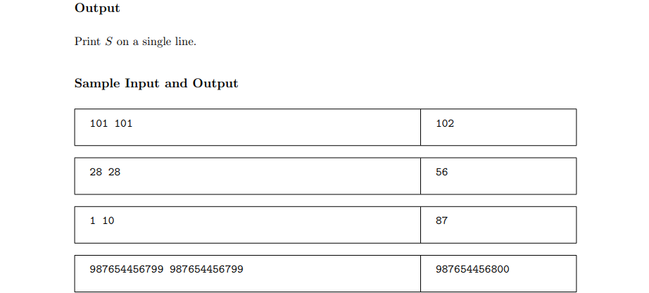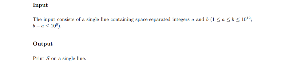 #include <bits/stdc++.h> using namespace std; typedef unsigned long long ll;//必须是unsigned ll f(ll n)//除法分块+等差数列求 { ll left,right; ll sum=0;//l 到 r中的因子不同但是个数相同都是n/left for(left=1;left<=n;left=right+1)//分块算因子和 { right=n/(n/left); sum +=(n/left)*(left+right)*(right-left+1)/2;//等差数列公式 } return sum; } int main() { ll a,b; cin>>a>>b; cout<<f(b)-f(a-1)<<endl; return 0; }