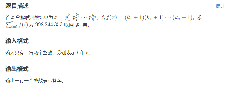 #include<iostream> #include<algorithm> #include<map> #include<cstring> #include<vector> using namespace std; typedef long long ll; const int maxn=3e6+100; const int mod=998244353; ll solve(ll n){ ll l,r;//数论分块 ll ans=0; for(l=1;l<=n;l=r+1){ r=n/(n/l); ans=(ans+(r-l+1)*(n/l))%mod; } return ans; } int main(){ ll l,r; cin>>l>>r; cout<<(solve(r)-solve(l-1)+mod)%mod<<endl; }