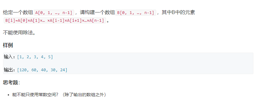 class Solution { public: vector<int> multiply(const vector<int>& A) { vector<int>left(A.size(),1); vector<int>right(A.size(),1); for(int i = 1;i<A.size();i++){ left[i] = A[i-1]*left[i-1]; } for(int i = A.size()-2;i>=0;i--){ right[i] = A[i+1]*right[i+1]; } vector<int>B(A.size(),0); for(int i = 0;i<A.size();i++){ B[i] = left[i]*right[i]; } return B; } };