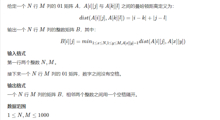 就是给你一个只含有0和1的矩阵,问你每一个0距离最近的1的最小距离为多少,如果这个位置上已经是1的就输出0