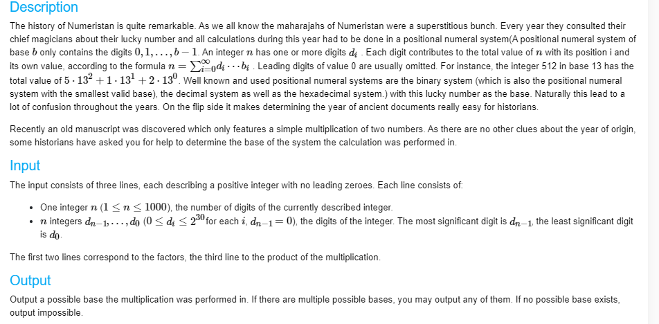 #include<iostream> #include<algorithm> #include<queue> using namespace std; typedef __int128 ll; const int maxn=2e6+100; const int N=1e3+100; inline __int128 read() { __int128 x=0,f=1; char ch=getchar(); while(ch<'0'||ch>'9') { if(ch=='-') f=-1; ch=getchar(); } while(ch>='0'&&ch<='9') { x=x*10+ch-'0'; ch=getchar(); } return x*f; } inline void write(__int128 x) { if(x<0) { putchar('-'); x=-x; } if(x>9) write(x/10); putchar(x%10+'0'); } ll x[N]; ll y[N]; ll z[N]; ll res[maxn]; ll ans[maxn]; int n,m,k; ll ma=0; int judge(ll mid){ ll yu=0; int pos; for(pos=0;;pos++){ if((ans[pos]+yu)==0&&pos>=n+m-2){ break; } res[pos]=(ans[pos]+yu)%mid; yu=(ans[pos]+yu)/mid; //cout<<res[pos]<<" "<<yu<<endl; } // cout<<mid<<" "<<pos<<endl; if(pos==k){ for(int i=pos-1;i>=0;i--){//一定要从大到小 // cout<<res[i]<<endl; if(z[i]<res[i]){ return pos+2; } else if(z[i]>res[i]){ return pos-2; } } return -1; } return pos; } int main(){ cin>>n; for(int i=n-1;i>=0;i--){ x[i]=read(); //scanf("%lld",&x[i]); ma=max(ma,x[i]); } cin>>m; for(int i=m-1;i>=0;i--){ y[i]=read(); //scanf("%lld",&y[i]); ma=max(ma,y[i]); } cin>>k; for(int i=k-1;i>=0;i--){ z[i]=read(); //scanf("%lld",&z[i]); ma=max(ma,z[i]); } for(int i=0;i<=n-1;i++){ for(int j=0;j<=m-1;j++){ ans[i+j]+=1ll*(x[i]*y[j]); } } //judge(4); /* for(int i=0;i<=n+m-2;i++){ cout<<ans[i]<<endl; } //*/ ll l=2,r=1e22,ans; while(r>=l){ ll mid=(l+r)/2; if(judge(mid)==-1){ if(mid<=ma){ cout<<"impossible"<<"\n"; return 0; } write(mid); //cout<<mid<<"\n"; return 0; } if(judge(mid)<k){ r=mid-1; } else{ l=mid+1; } } cout<<"impossible"<<"\n"; }