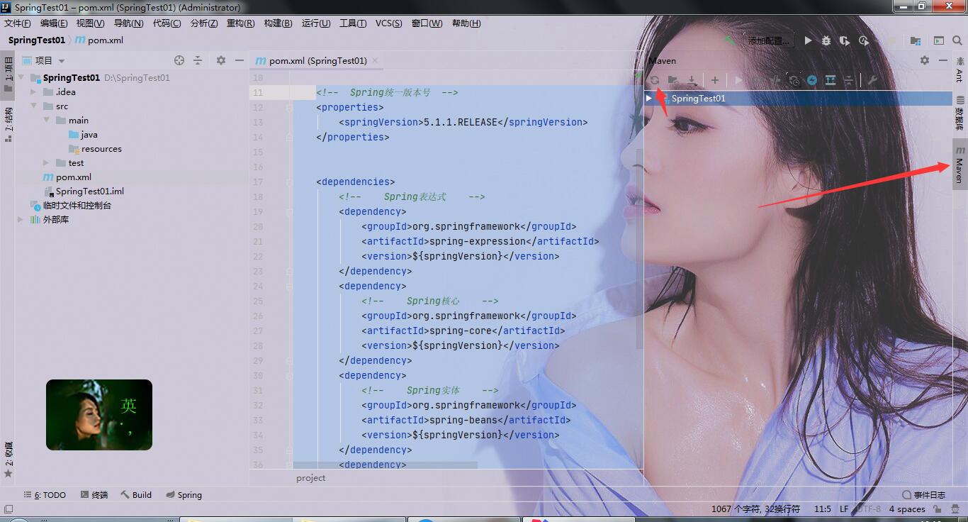 5、配置好xml文件之后点击旁边的Maven刷新一下,如果自己的Maven库没有相应jar包的话idea会自动去网上下载(需要稍等一会)