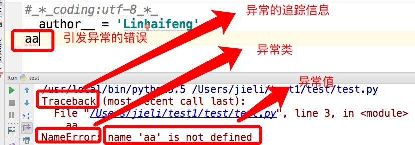 异常就是程序运行时发生错误的信号(在程序出现错误时,则会产生一个异常,若程序没有处理它,则会抛出该异常,程序的运行也随之终止),在python中,错误触发的异常如下