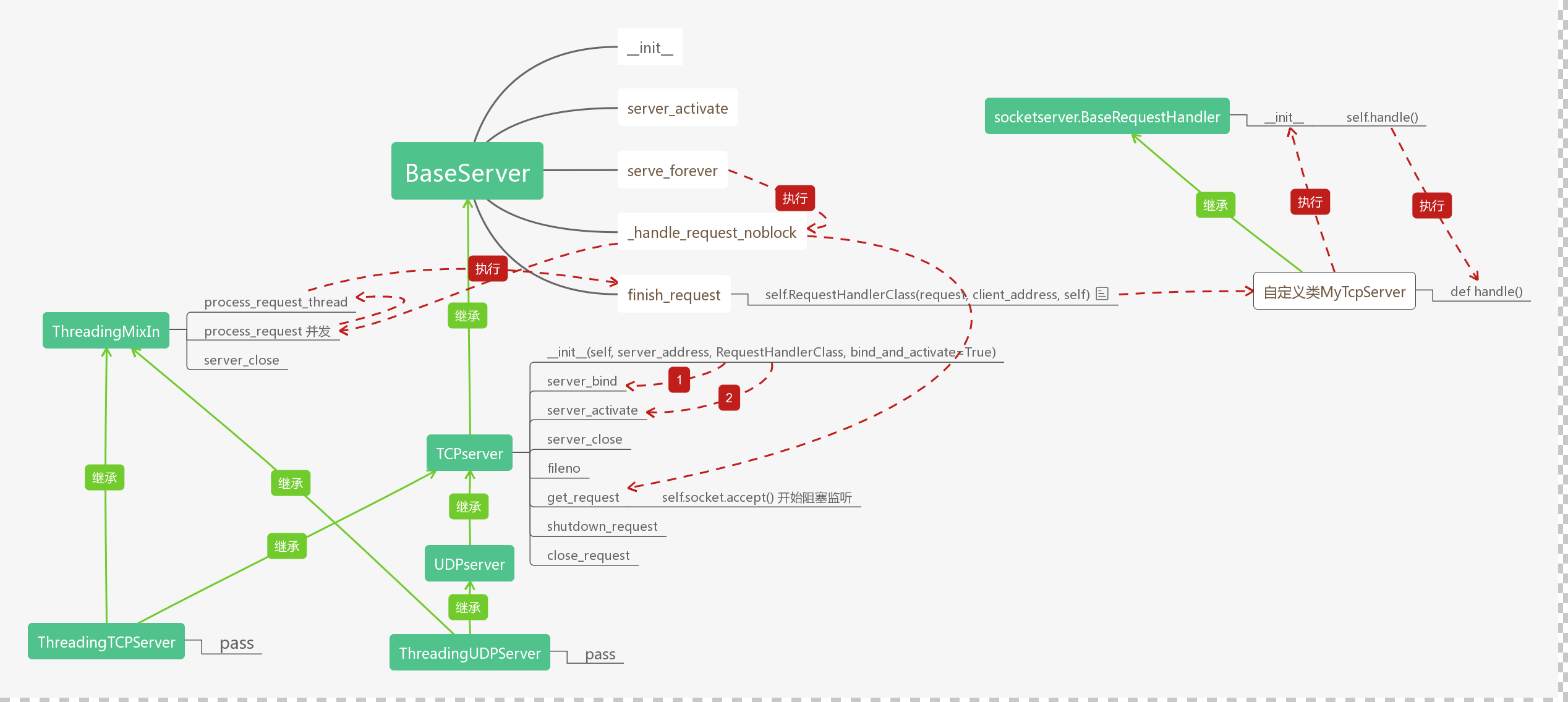 - 执行self._handle_request_noblock()进而执行request, client_address = self.get_request()(就是TCPServer中的self.socket.accept()),然后执行self.process_request(request, client_address)