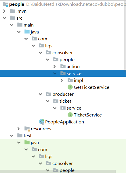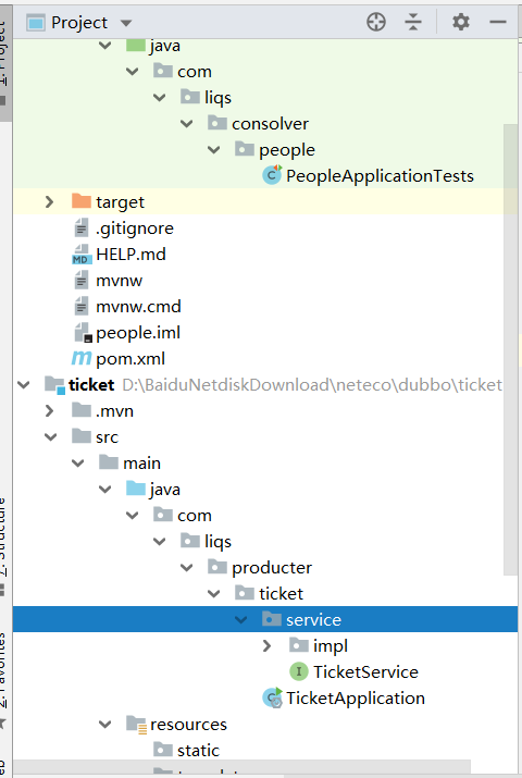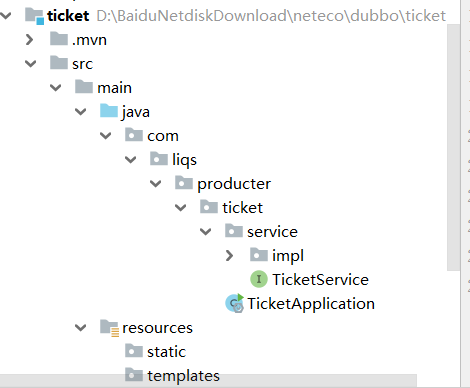 总共两个工程。一个是ticket属于生产者,里面的service就打印一句话:get a ticket 然后消费者 user工程。测试类调用