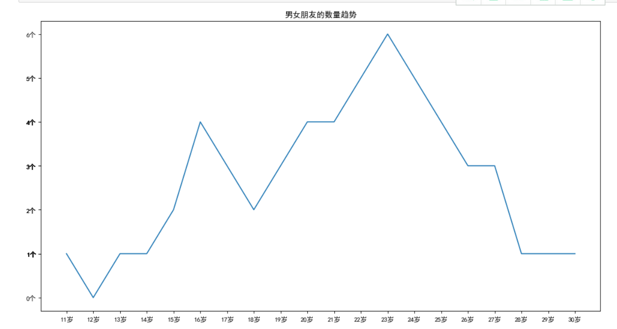 - 假设大家在30岁的时候,根据自己的实际情况,统计出来了从11岁到30岁每年交的女(男)朋友的数量如列表a,请绘制出该数据的折线图,以便分析自己每年交女(男)朋友的数量走势