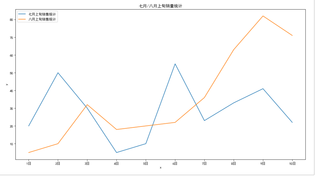 from matplotlib import pyplot as plt #设置中文 plt.rcParams['font.sans-serif']='SimHei'#用来正常显示中文标签 plt.rcParams['axes.unicode_minus'] = False #用来正常显示负号 #X和y1,y2的取值 x = range(1,11) y1 = [20,50,30,5,10,55,23,33,41,22] y2 = [5,10,32,18,20,22,36,63,82,71] #设置画布 plt.figure(figsize=(15,8),dpi = 80) plt.title("七月/八月上旬销量统计")#设置标题 #添加七月八月的图像 plt.plot(x,y1,label = "七月") plt.plot(x,y2,label = "八月") #设置x的刻度 xticks_label = ["{}日".format(i) for i in x] plt.xticks(x,xticks_label) #添加x轴y轴的名称 plt.xlabel("x") plt.ylabel("y") plt.legend(["七月上旬销售统计","八月上旬销售统计"]) plt.show()