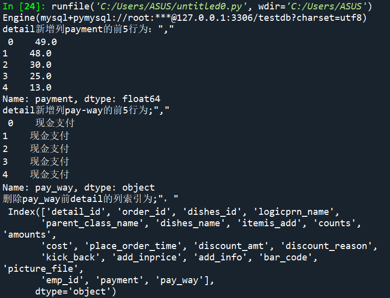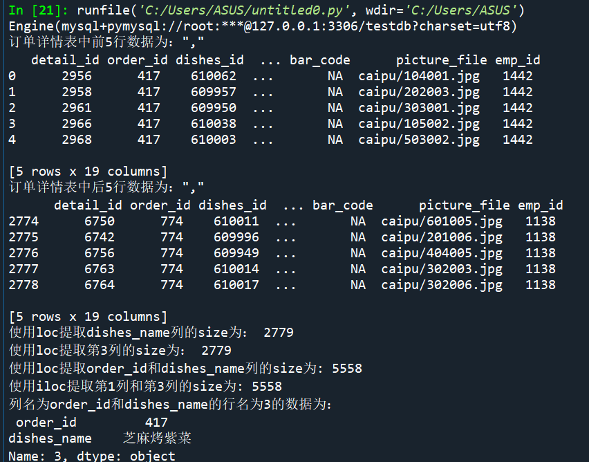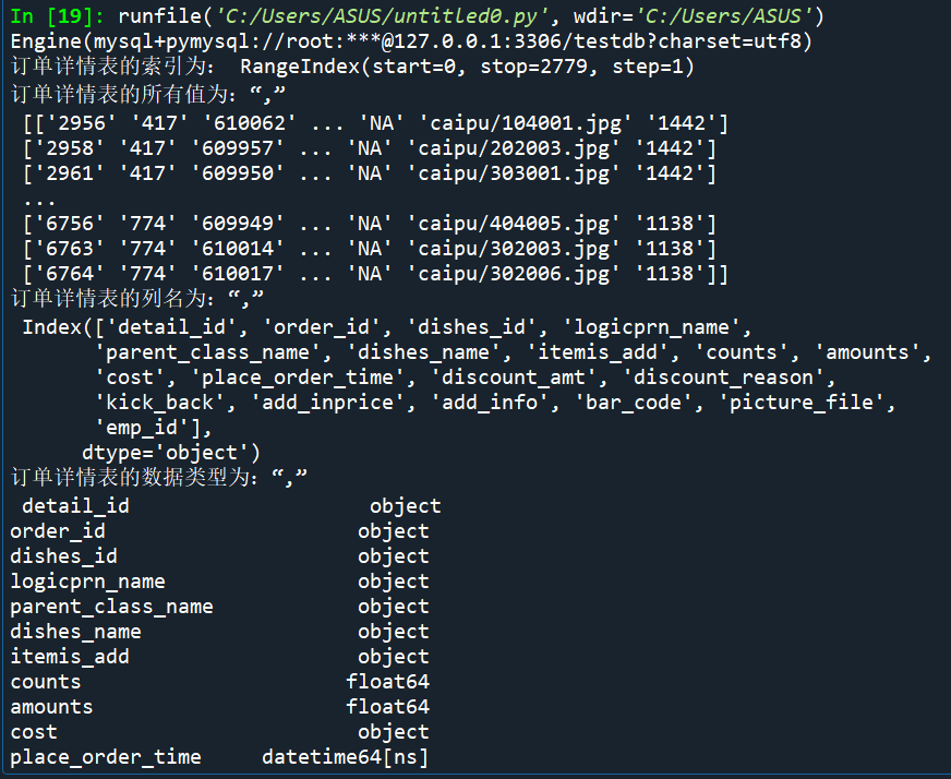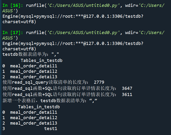 代码4-2 import pandas as pd #使用read_sql_query查看testdb中的数据表书目 formlist=pd.read_sql_query('show tables',con=engine) print('testdb数据表清单为:","\n ',formlist) detail1=pd.read_sql_table('meal_order_detail1',con=engine) print("使用read_sql_query读取清单的长度为:",len(detail1)) detail2=pd.read_sql('select*from meal_order_detail2',con=engine) print("使用read_sql函数+SQL语句读取的订单详情表长度为:",len(detail2)) detail3=pd.read_sql('meal_order_detail3',con=engine) print('使用read_sql函数+SQL语句读取的订单详情表长度为:',len(detail3))