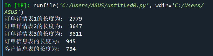 from sqlalchemy import create_engine engine=create_engine("mysql+pymysql://root:root@127.0.0.1:3306/testdb?charset=utf8") import pandas as pd order1=pd.read_sql_table('meal_order_detail1',con=engine) print("订单详情表1的长度为:",len(order1)) order2=pd.read_sql_table('meal_order_detail2',con=engine) print("订单详情表2的长度为:",len(order2)) order3=pd.read_sql_table('meal_order_detail3',con=engine) print("订单详情表3的长度为:",len(order3)) 代码4-10 order4=pd.read_table('F:/meal_order_info.csv',sep=",",encoding='gbk') print('订单信息表的长度为:',len(order4)) 代码4-11 user=pd.read_excel('F:/users.xlsx') print('客户信息表的长度为:',len(user))