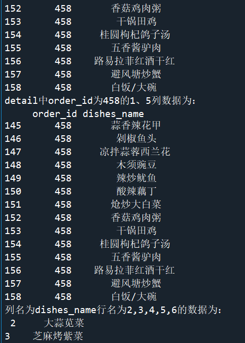 print('detail中order为458的dishes_name为;\n',detail.loc[detail['order_id']=='458',['order_id','dishes_name']])