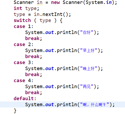 switch ( 控制表达式 ){ case 常量: 语句 …… case 常量: 语句 …… default: 语句 …… }