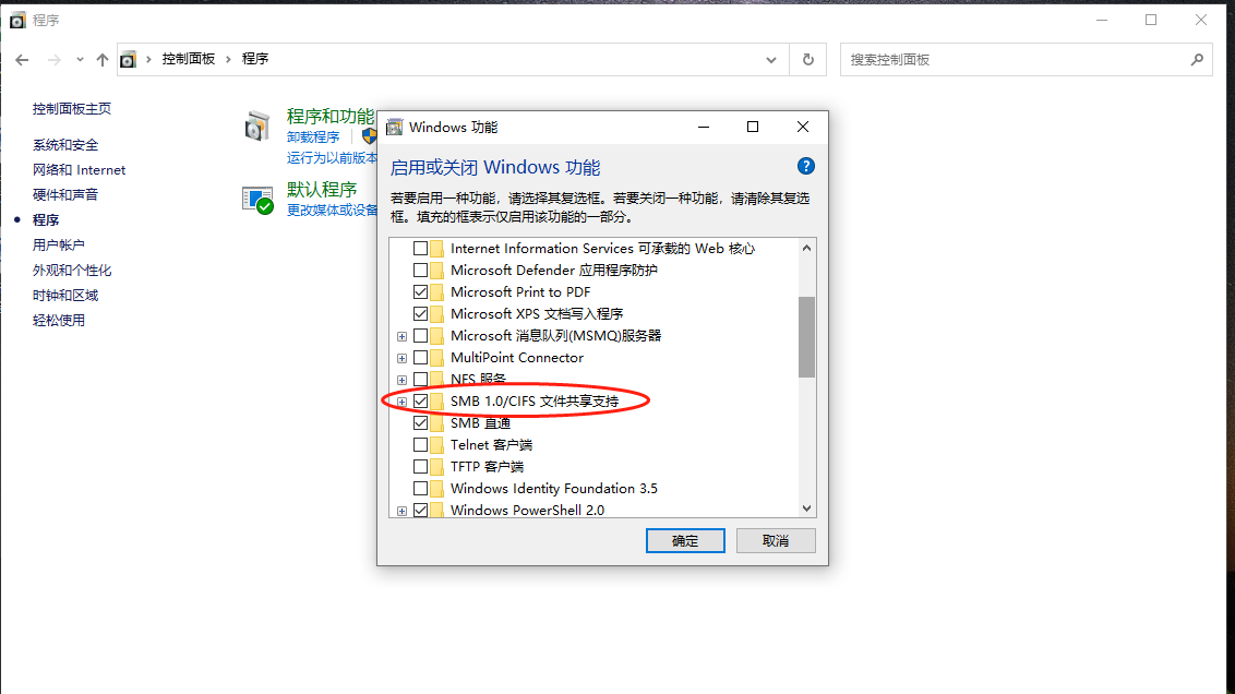 直到我突然灵光一闪,我发现了下我的SMB1.0功能没开。。。