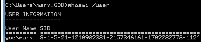 采用这种方法,可以以普通域用户权限获取域内大部分用户的 SID,可以看到域 god.org 的域 SID 为:S-1-5-21-95064677-3481858386-3840636109。