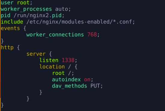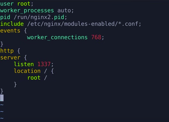 use root; #run the web server as root user events{worker_connections 768;}. #sets the maximum number of simultaneous connections that each worker process can handle.The value here doesn't matter so i just picked an arbitrary number.if this parameter isn't set,i'll get the error 'nginx:[emerg]no "events" section in configuration' http{ server {}} --specifies i want an http web server listen 1337 -- specifies the port that the web server will listen on. location / {root / } -- sets the directory that the web server will be hosted from to the '/' directory of the root user.