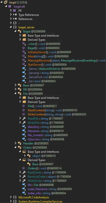 The program has the namespace bagel_server, with six classes in it. The main program is based out of the Bagel class, which starts in Main, but really is handled by MessgeReceived.