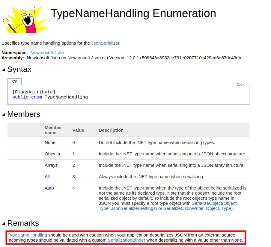 The fact that both are setting the TypeNameHandling to 4 is important. The docs hint at the risk here: