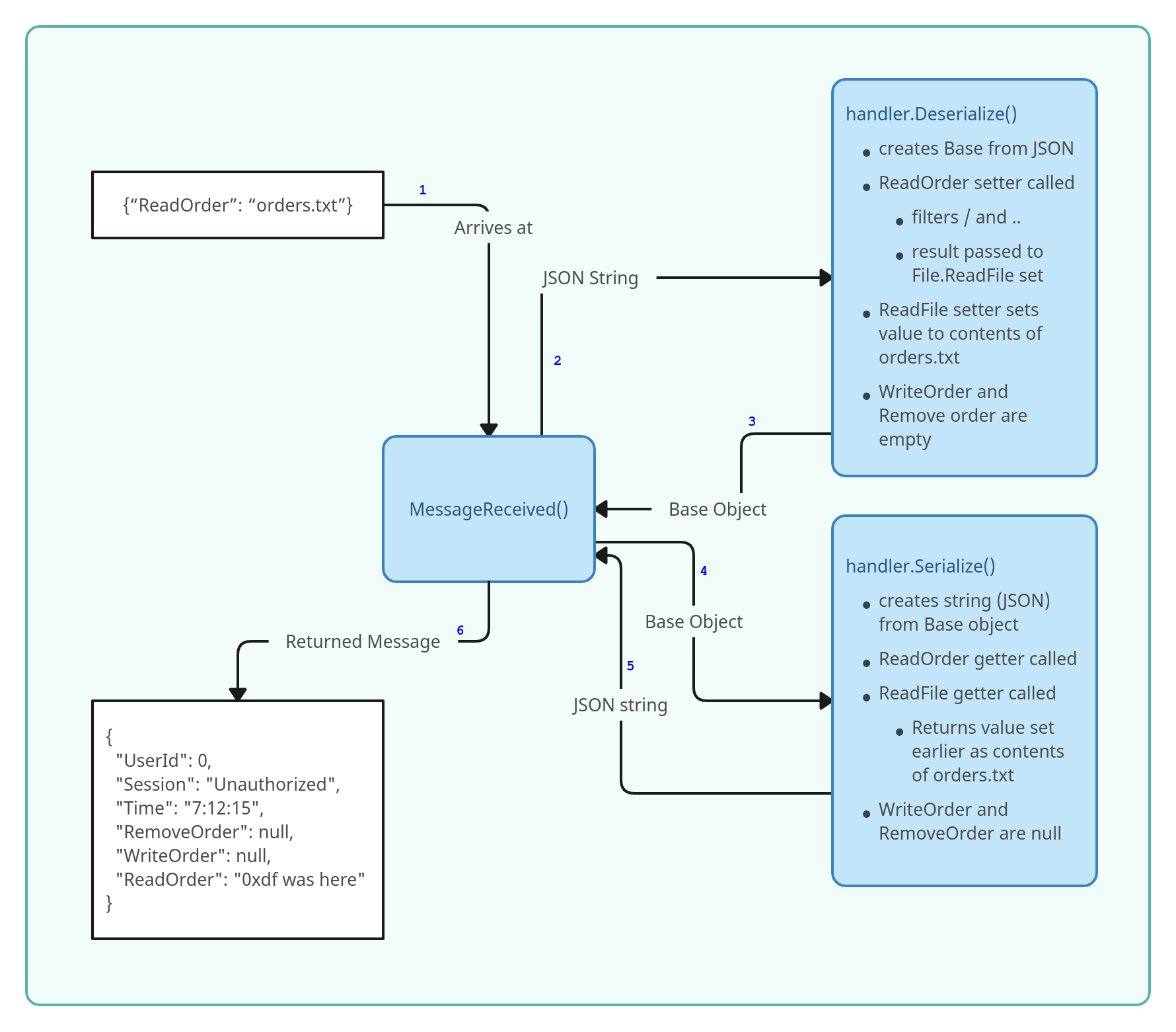 This diagram attempts to summaries how the base case of the message {"ReadOrder": "orders.txt"} is processed by the server:
