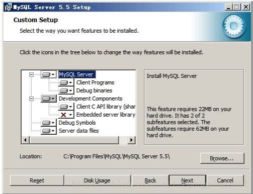 所有可用组件列入定制安装对话框左侧的树状视图内。未安装的组件用红色 X 图标表示;已经安装的组件有灰色图标。要想更改组件,点击该组件的图标并从下拉列表中选择新的选项。