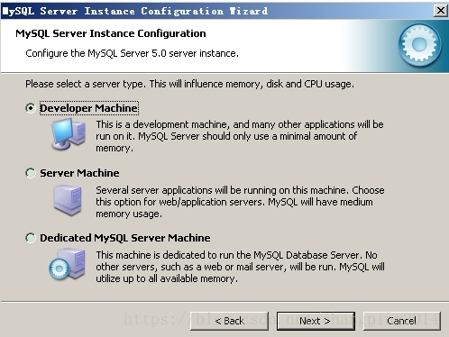 可以选择3种服务器类型,选择哪种服务器将影响到MySQL Configuration Wizard(配置向导)对内存、硬盘和过程或使用的决策。