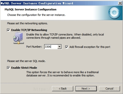在Networking Options(网络选项)对话框中可以启用或禁用TCP/IP网络,并配置用来连接MySQL服务器的端口号。默认情况启用TCP/IP网络。要想禁用 TCP/IP网络,取消选择Enable TCP/IP Networking选项旁边的检查框。 默认使用3306端口。要想更访问MySQL使用的端口,从下拉框选择一个新端口号或直接向下拉框输入新的端口号。如果你选择的端口号已经被占用,将提示确认选择的端口号。