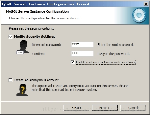 强烈建议为你的MySQL服务器设置一个root密码,默认情况MySQL Configuration Wizard(配置向导)要求你设置一个root密码。如果你不想设置root密码,不选中Modify Security Settings(修改安全设定值)选项旁边的选择框。 要想设置root密码,在New root password(输入新密码)和Confirm(确认)两个框内输入期望的密码。如果重新配置已有的服务器,你还需要Current root password(当前root密码)框内输入已有的root密码。 要想防止通过网络登录,不选中Enable root access from remote machines(不允许远程连接)选项旁边的框。这样可以提高安全。 要想创建一个匿名用户账户,选中Create An Anonymous Account(创建匿名账户)选项旁边的框。创建匿名账户会降低服务器的安全,并造成登录和许可困难。因此不建议。