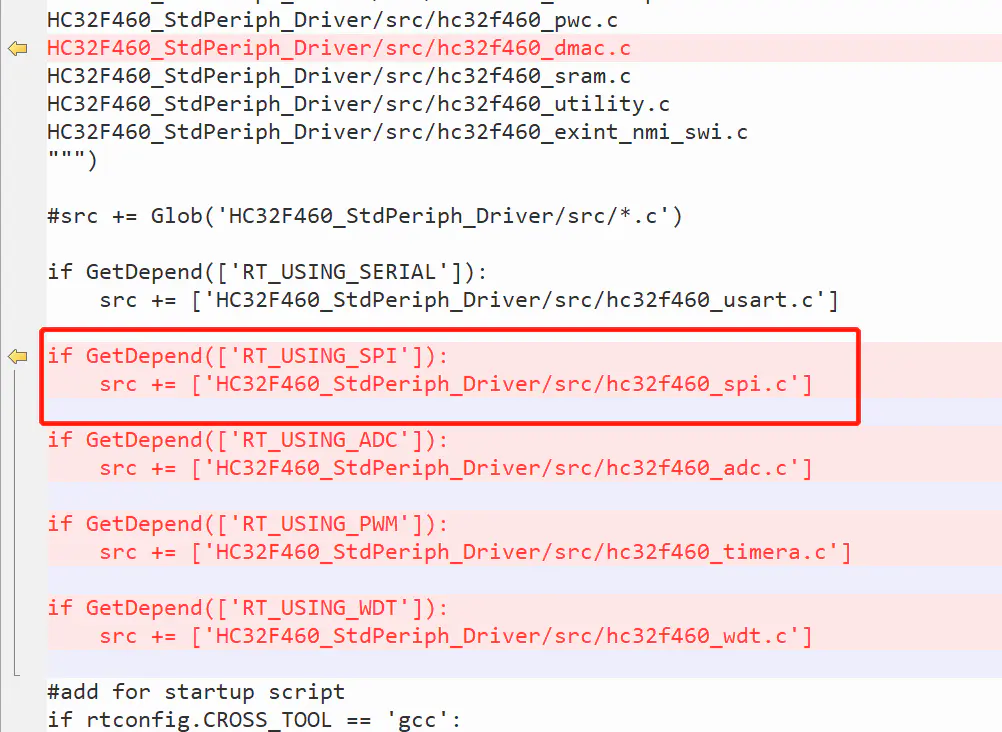 * 修改Libaries\SConscript包含hc32f460_spi.c,如果需要dma的话把dma添加到公共部分